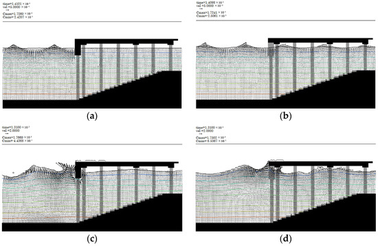 Velocity vectors: (a) normal waves and impermeable conditions, 141 s; (b) normal waves and permeable conditions, 141 s; (c) storm waves and impermeable conditions, 131 s; (d) storm waves and permeable conditions, 131 s.