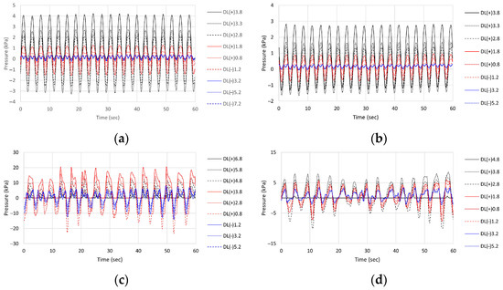 Dynamic wave pressure time series: (a) Row 1, normal conditions; (b) Row 5, normal conditions; (c) Row 1, storm conditions; (d) Row 5, storm conditions.
