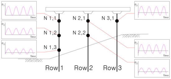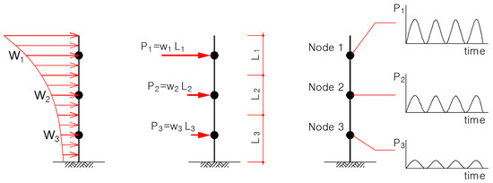The computed dynamic wave forces were incorporated into a structural analysis model. Time-dependent dynamic wave forces require substantial input data, leading to prolonged analysis times. As illustrated in Figure 5, time-varying wave force values were inputted at representative nodes, reducing the data volume and computational time whilst maintaining result accuracy. For example, wave pressure w1 within the range of steel pipe pile L1 can be input as a time-varying load P1 at Node 1. Figure 6 illustrates the conceptual diagram of simply applying wave pressures to representative nodes. Figure 7 presents the input values of the dynamic wave pressures at DL. (+3.8) for the representative points in Rows 1 and 5.