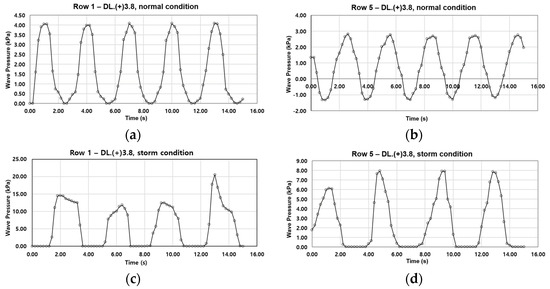 Dynamic wave inputs under normal conditions (a,b) and storm conditions (c,d): (a) Row 1 DL. (+)3.8; (b) Row 5 DL. (+)3.8; (c) Row 1 DL. (+)3.8; (d) Row 5 DL. (+)3.8.