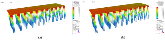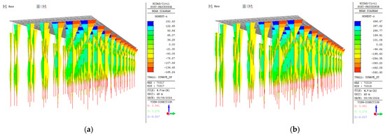 A comparative study of sectional forces in piles was performed for static and dynamic wave forces under both normal and storm conditions. The analysis differentiated between berthing piles (Φ812.8) and inner piles (Φ1100). Figure 11 presents the dynamic analysis results for normal wave forces under storm conditions. As summarized in Table 3, the results indicated that the dynamic analysis consistently produced higher sectional forces compared with the static analysis.