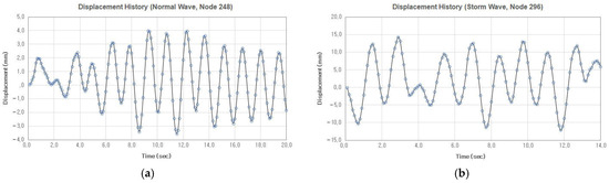 Figure 10 illustrates the displacement history at locations experiencing maximum displacements under normal and storm conditions according to the dynamic analysis. The dynamic wave forces induced structural vibrations; these are shown in the figure.