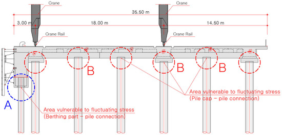 Studies have been conducted on the structural safety of pier structures composed of concrete and steel members, and their behavior under dynamic wave and uplift forces. However, studies specifically addressing the dynamic behavior and fatigue effects related to pier structures are rare. Experimental studies on pier structures emerged around 2020, but these studies predominantly involved static analyses to verify the structural performance of new construction methods. Min et al. conducted a study on the horizontal cyclic loading of pier–structure connections in 2017 [37]. Their research was limited by the number of repetitions (<10 cycles), which was insufficient to reflect the dynamic load of waves.
