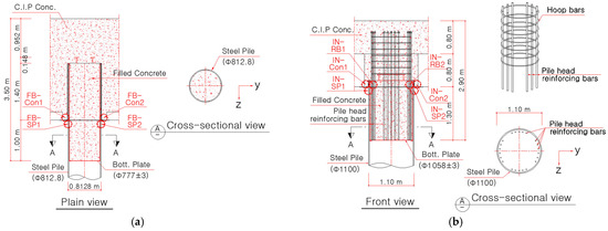 Connection details between upper structure and piles: (a) Detail A (berthing section and pile junction); (b) Detail B (pile cap and pile junction).