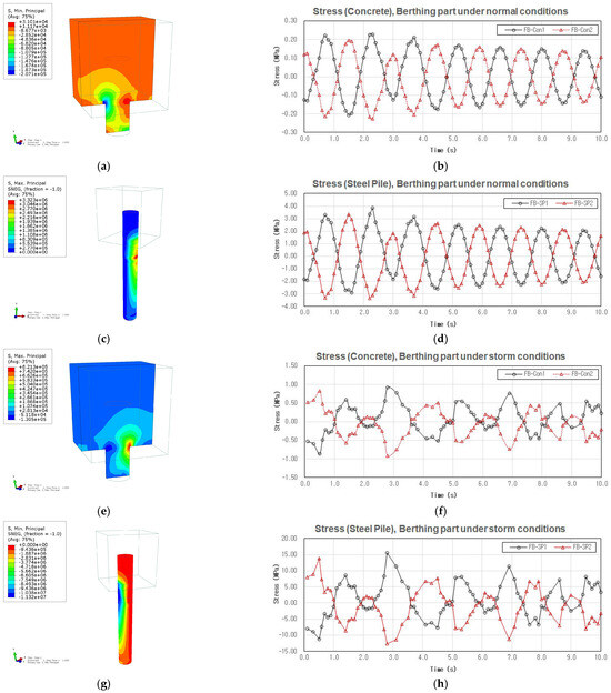 Berthing section and pile part (Detail A) under normal conditions (a–d) and under storm conditions (e–h): (a) concrete stress distribution (comp. 0.207 MPa); (b) concrete stress history; (c) steel pipe stress distribution (tens. 3.323 MPa); (d) steel pipe pile stress history; (e) concrete stress distribution (tens. 0.821 MPa); (f) concrete stress history; (g) steel pipe stress distribution (comp. 11.320 MPa); (h) steel pipe pile stress history.