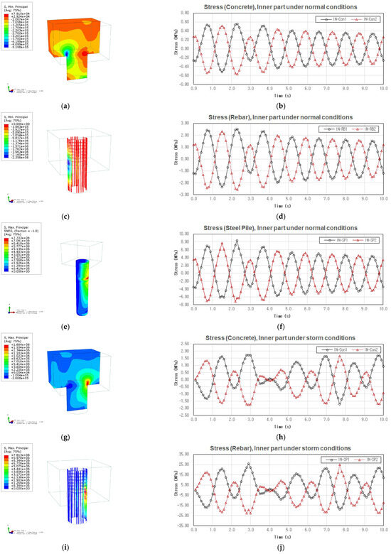 Figure 15 depicts the stress distributions and histories of the inner pile cap concrete, steel pipe piles, and steel rebar (Detail B) under normal and storm conditions. In Detail B, the concrete points are IN-Con1 and IN-Con2, the steel pipe pile points are IN-SP1 and IN-SP2, and the reinforced bar points are IN-RB1 and IN-RB2.