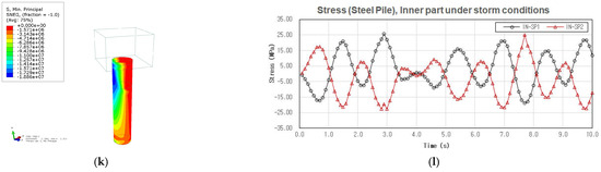 Inner part pile cap and pile part (Detail B) under normal conditions (a–f) and under storm conditions (g–l): (a) concrete stress distribution (comp. 0.520 MPa); (b) concrete stress history; (c) steel rebar stress distribution (comp. 2.356 MPa); (d) steel rebar stress history; (e) steel pipe stress distribution (tens. 7.703 MPa); (f) steel pipe pile stress history; (g) concrete stress distribution (tens. 1.664 MPa); (h) concrete stress history; (i) steel rebar stress distribution (tens. 7.613 MPa); (j) steel rebar stress history; (k) steel pipe stress distribution (comp. 18.860 MPa); (l) steel pipe pile stress history.