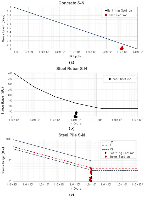 Fluctuating stresses at concrete–pile interfaces in berthing sections and inner pile cap–pile junctions were quantified and plotted using S–N curves. Figure 16 illustrates the S–N curves and the corresponding stress occurrences for the concrete components, steel rebars, and steel pipe piles at the berthing section connections and inner sections. Figure 16a provides the S–N curve for concrete, which can be derived using Equation (2). Moreover, the fluctuating stresses at the berthing and inner sections, along with the frequency of these stresses during the service life, are depicted in the graph. Figure 16b presents the S–N curve for steel rebar, plotted using Equation (3). The graph also visualizes the stresses occurring in the inner section rebars and the frequency of these stresses throughout the service life. Finally, Figure 16c demonstrates the S–N curves for steel pipe piles based on welding details (B2, F, and F3), while also capturing the stresses acting on the steel pipe piles and their occurrence frequencies over the service life.