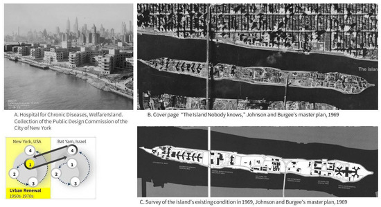 RI was not part of the urban renewal conundrum. When NYC went through Robert Moses’s slum clearance era, RI served as a haven for medical institutions. It was in 1921 that the former Blackwell Island, which housed a prison, a psychiatric asylum, and a smallpox hospital, was converted into Welfare Island and transformed into a health care center (Figure 4). The change included evacuating and demolishing the penitentiary and opening two hospitals for chronic disease: Goldwater Memorial Hospital and its sister institution Coler Specialty Hospital [34]. At this stage of massive housing changes in NYC, when the slums were removed and replaced with the Public Housing project or Highways, RI was a separate piece of land, not designated for residential development and not part of the public debate.