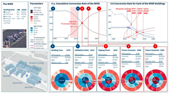Figure 11, Graph A, illustrates the conversion rates of each building in relation to one another, showing a distinct shift from fully affordable units to an increasing proportion of market-rate units. This trend is further detailed in Graph B, which depicts the cumulative demographic changes across the four buildings and forecasts that, by 2032, the number of market-rate apartments in the WIRE complex will surpass that of affordable units, marking a critical tipping point for the complex. By 2040, 65% of the units are projected to be market-rate, with this share rising to 85% by 2060.