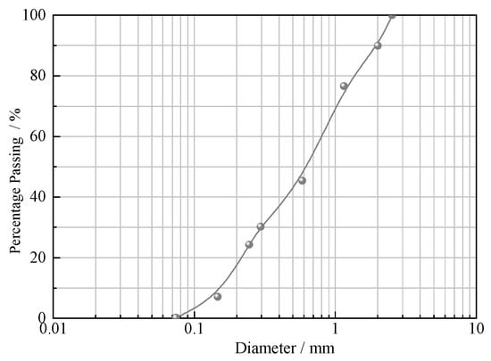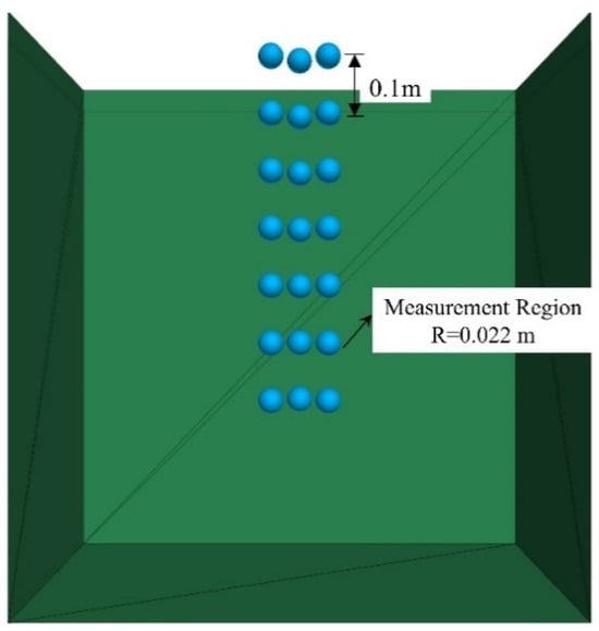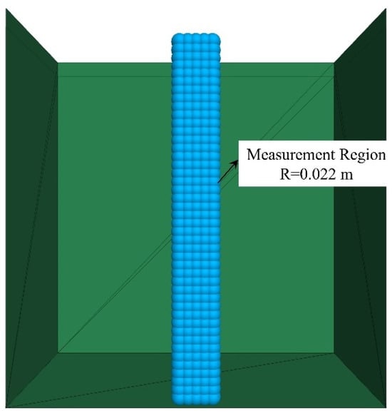 - Particle size mixing zones, M12, M23, …, M(n−1)n, are set up between each neighboring region to prevent particle embedding at the boundaries, which could impact the overall density of the discrete element model. The particle sizes in these mixing zones are proportionally blended according to the sizes from adjacent areas. When forming the mixing zones, this paper specifies the fc for small-sized particles in these zones at 33.3% to achieve optimal compactness of the particles [45]. Additionally, due to the variation in particle sizes across different regions, it is essential to adjust the micromechanical parameters of particles in each area using a specific conversion ratio to maintain consistent macroscopic physical and mechanical properties in the sand soil foundation. Consequently, optimizing the microparameters by the ratio of particle stiffness to average particle diameter ensures consistent macroscopic mechanical characteristics among particles from different regions. The resulting particle diameters and microparameters are presented in Table 3.
