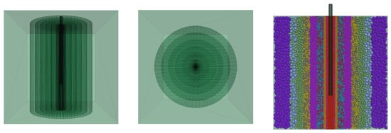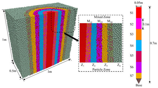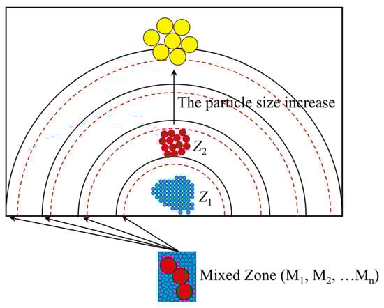 - Divide the discrete element model into different regions, labeled from nearest to farthest as Z1, Z2, …, Zn. Particles in the core area directly contact the pile body, necessitating the generation of smaller particle sizes in this zone, which are continuously recalibrated to achieve a balance between computational precision and efficiency;