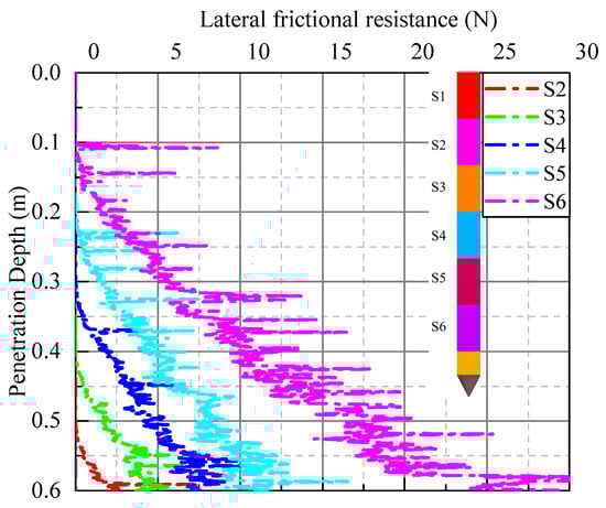 - Comparing the penetration resistance and displacement from laboratory experiments and discrete element simulations, the numerical model and parameter choices of this study are appropriate. Fluctuations in the simulation result from interactions between the pile foundation and soil particles. In the 0-5 cm penetration phase, the penetration resistance quickly increases and becomes stable with increasing penetration depth. As the penetration depth of the pile foundation increases, the lateral friction resistance also increases. Near the cone tip, the lateral friction peaks due to increased horizontal stress and soil density, which enhance the lateral constraining force and friction on the pile foundation.