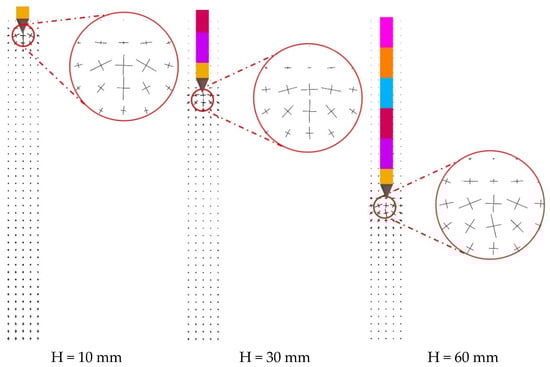 - The greatest displacement of the foundation particles is concentrated near the pile sides and the cone tip, primarily affecting areas within twice the diameter of the pile. The areas affected by penetration are categorized into three zones: an intense disturbance zone (at the pile side and tip, with maximum friction and compression), a moderate disturbance zone (within one pile diameter, where particles are slightly moved by the intensely disturbed area), and a light disturbance zone (minor displacement, distant from the pile foundation, with less impact). Particle displacement vectors are primarily directed vertically downward, driven by lateral friction along the pile sides, while those in the pile tip region exhibit compression characteristics during cone tip penetration. As the pile foundation penetrates, particles in the pile side area rotate significantly, driven mainly by lateral friction, with fewer rotations in the particles at the pile end.