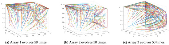 In order to analyze the influence of the change in each factor on the evolution of the strategy and verify the effectiveness of the model, it is necessary to assign values to the variables. To ensure that the variable values are realistic and that the errors remain within a range that does not affect the outcomes, we consulted the frontline employees of the companies. Based on this, we obtained Array 1, , , , , , , , , , , , , satisfying cases I and III. To further verify the validity of stability analysis, we took array 2, , , , , , , , , , , , , satisfying cases I and II. We also took array 3, , , , , , , , , , , , , satisfying case IV. Using MATLAB 2016b for three sets of values, numerical simulations were performed. According to the simulation results of Figure 1, the evolutionary stability points of Array 1 are and , and those of Array 2 are and , and those of Array 3 are , which are consistent with the results of the stability analysis of the equilibrium points given above.