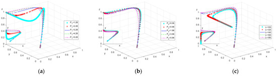 To analyze the impact of breach compensation amounts and accident-related losses on the evolutionary game process and outcomes, is assigned the values , respectively; is assigned the values , respectively; and is assigned the values , respectively. The simulation results are shown in Figure 4.