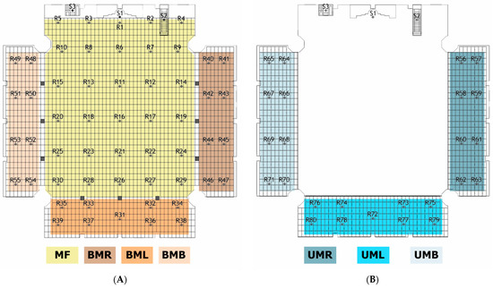 (A) Ground Floor Source and Receiver Locations. (B) Mahfil Floor Source and Receiver Locations (S1-Friday and daily prayer activity, S2-Friday khutba activity, S3-Sermon activity).