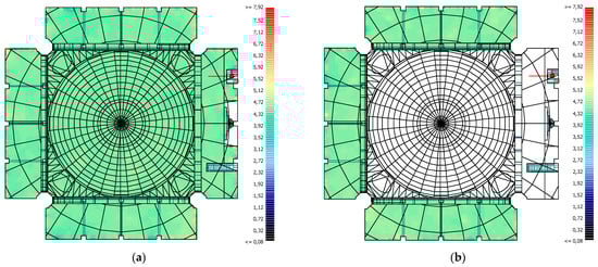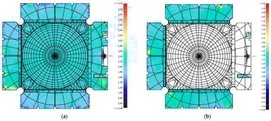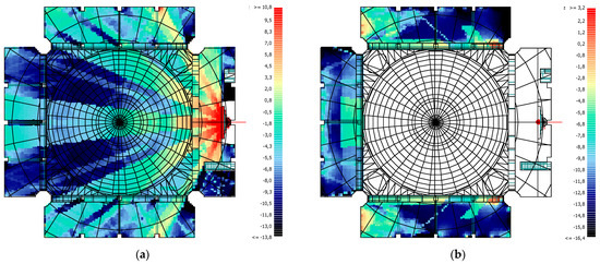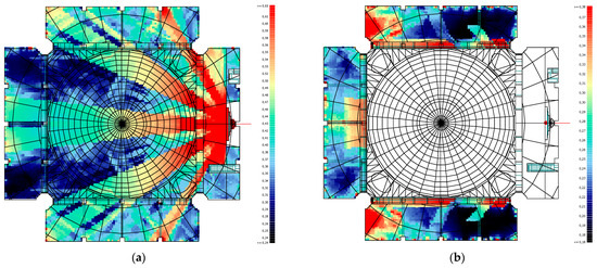 The lowest values at medium and high frequencies are observed in BML and BMR, respectively. It is seen that the reverberation time values obtained at BML are lower than the values obtained at BMR. This is related to the direction of the source and the source position. When the delay times of the reflections coming to the BML are compared with the delay times, sound pressure levels and numbers of reflections coming to the receivers symmetrical to the mihrab axis, it will be seen that the reflection delays of the receivers in the BMR are shorter, the sound pressure levels are higher and the number is higher. This explains why the reverberation times at the BML are higher than at the BMR. At low frequencies, the same effect is not seen at low frequencies because the absorption coefficient of the seated congregation is lower than at medium and high frequencies. This explains the difference in reverberation time between BMR and BML and also shows the importance of source orientation. As a result of the source direction, when the frontal region values are analysed under the side enclosure, it is seen that the reverberation time of the BMR is higher than that of the BML. Due to the direction of the source, the energy of the sounds coming from the sidewalls adjacent to the qibla wall to the left sidewall, which is reflected to the BMR, is higher than the sound energy coming from the right sidewall. As the front regions cannot receive direct sound energy due to the source position, these regions only benefit from reflected sound. This resulted in higher times than for symmetrical reverberation times in the front regions of the BMR. The area between the minbar and the side wall had high reverberation times due to repeated reflections. The same applies to the area between the pulpit and the side wall. In addition, lower reverberation times are observed in areas where direct sound is shadowed compared to other areas (Figure 10a,b).