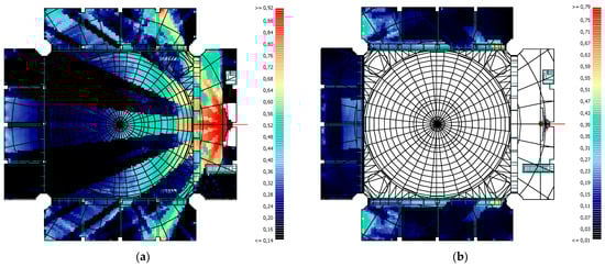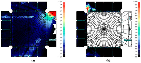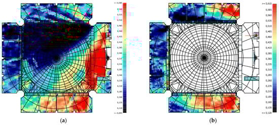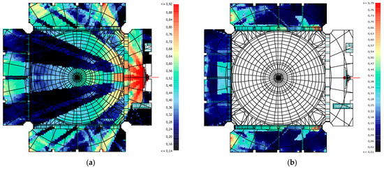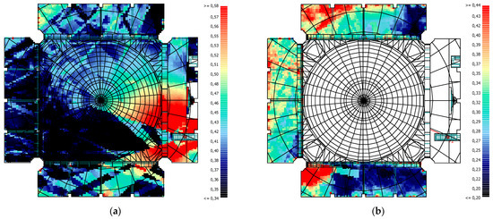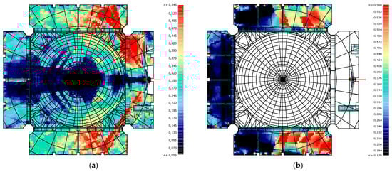 Upon analysis of the values obtained for the D50 parameter, one of the speech intelligibility parameters, it was found that the lowest values were obtained in the Sermon activity. This was due to the fact that the highest T30 and Ts parameter values were obtained in the Sermon activity. The reason for the high values of T30 and Ts parameters is that the congregation in the masjid is so small that it can be accepted as non-existent. In all activities, reverberation time decreases as we move to higher frequencies. Consequently, the values of the D50 parameter increase as we move to higher frequencies. The reference value range for the D50 parameter is 0.30–0.70. When considering the values obtained, only in the Friday Khutba and Friday Prayer activities, values at the lower limit of the reference range were obtained at high frequencies. This is due to the fact that the lowest reverberation times were obtained in these activities. Consequently, the low D50 value will result in a reduction in speech intelligibility. In general, high values are typically observed in areas close to the source, while these values decrease in areas with acoustic shadows. The impact of the mihrab shape and surface dimensions on the activities of Friday Prayer and Daily Prayer, as well as the influence of the minbar door on the Friday Khutba activity, can be clearly observed in the D50 values’ grid calculations. The mihrab’s distinctive shape, comprising large-sized surfaces, has resulted in a non-uniform distribution of D50 values, with lower values observed in certain regions due to scattering and breakage at the junction points (Figure 29).