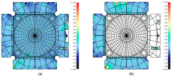 When the general values obtained in the masjid are analysed, it is seen that C50 values are low, especially at low frequencies. Values considerably lower than the reference value of >0 dB for C50 were obtained. The values obtained for BML and BMR are acceptable. Significant increases in C50 values are observed with decreasing reverberation time values as we move towards high frequencies. In places with high T30 parameter values, the reverberant sound is high and therefore low C50 values are obtained in these regions. This situation clearly shows the effect of reverberation time on the clarity parameter. Low clarity throughout the masjid is an indication that speech intelligibility will also remain at low levels. The area between the minbar and the side wall on the Namazgah floor has a low C50 value. The effect of the shape of the mihrab on C50 can also be clearly seen in the grid calculation. Due to the form of the mihrab, inhomogeneous values have emerged in the hall. A mihrab formed with more and smaller sized surfaces will provide more homogenous values (Figure 6a). Low C50 values at the mahfil floor also reduce the general average for the hall. The highest C50 values are observed under the right and left cellars, respectively. The fact that the BML is higher than the BMR can be said to be due to the shading of the direct sound by the minbar for certain regions and the reflections provided by the minbar to the BML. Lower C50 values were obtained in the inner regions that could not receive direct sound, compared to the edge regions of the mahfil. C50 values are higher in the rear sections of the UMR and UML. The sounds reflected from the side and rear wall of the side vaults provided a more favourable C50 value in the region just in front of this surface. In UMB, low values were observed at the rear corners due to the concave form of the ceiling and the focusing of the reflections from the main dome. In this region, although higher values were observed in the front areas receiving direct sound rays, the highest values were concentrated in the front centre region of the mahfil due to the focusing caused by the concave form of the dome and the ceiling (Figure 6b).