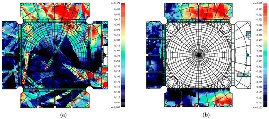 When the values obtained for the LF80 parameter, which is another sound energy parameter and shows the lateral sound energy, are analysed, the lowest values were obtained in the Friday Khutba activity. In this activity, the source is in the minbar, which is very close to the side wall. Therefore, the lateral reflections from the near side wall are blocked by the minbar. Likewise, a very limited area could be reflected from the far side wall due to the position of the source. In the Friday Khutba activity, low values were obtained due to the location and orientation of the source. In the Sermon activity, the side wall close to the minbar and pulpit provided early lateral reflections to a very large area due to the source location. In addition, due to the high reverberation time, the sound energy continued its presence in the volume for a longer time. Therefore, the highest LF80 parameter values were obtained in the Sermon activity. In Daily Prayer and Friday Prayer, the source is located at the mihrab in the centre of the masjid. Therefore, low values were obtained in a very small area around the centre axis perpendicular to the qibla wall of the masjid. Useful lateral reflections were provided at the minbar and side wall. However, due to the location and orientation of the source and the fact that the reverberation time is considerably lower than the Sermon, the overall averages of the Friday Prayer and Daily Prayer activities are lower in the Sermon activity. When all these results are evaluated, the positive effect of a reflective surface close to the source on lateral reflections can be clearly seen (Figure 28).