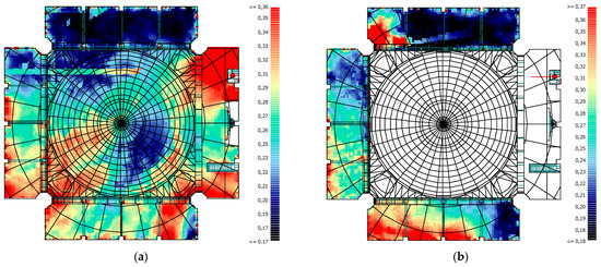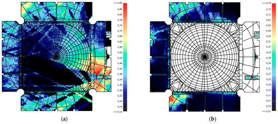 When STI (Male) is analysed, the average STI (Male) values in all masjids and in all regions are found to be poor. This indicates that speech intelligibility is low for preaching. The lowest value was obtained at BML with 0.18, while the highest value was obtained at BMR with 0.30. The side wall creates an acoustic shadow in a significant portion of the BML, and the effect of creating an acoustic shadow is also pronounced due to the proximity of the columns to the source in the sermon activity. Consequently, the lowest values were obtained in BML. Sounds reflected from the side wall in close proximity to the source will reach the receiver immediately after the direct sound. Reflections that reach the receiver immediately after the direct sound reinforce the direct sound. Sounds reflected from the side wall are directed towards the BMR. As a consequence of the fact that this region receives both direct sound and the direct sound is supported by early reflections from the side wall, the highest values in the masjid were obtained in this region. An increase in the STI value is observed in the area where focusing occurs in the MF. Furthermore, high values were also obtained in close proximity to the source point. Similarly, elevated values were observed in the region between the minbar and the side wall, as well as in the front of the BMR, due to the focusing effect of the concave ceiling above the mihrab. Conversely, low values were obtained in the BML due to the acoustic shadow cast by the side wall’s mahfil bearing columns, which prevent direct sound from reaching the region (Figure 24a). Upon analysis of the mahfil floor, it was observed that low values were obtained in the front sections of the side mahfil, which are unable to receive reflections with a short delay time. Conversely, relatively high values were obtained in the rear sections of the side mahfil, where reflections from the dome were present. A similar pattern was observed in UMB, where high values were obtained to the right of the mihrab axis. The area to the front right of the dome, which does not receive reflections from the side walls, exhibited low values (Figure 24b).