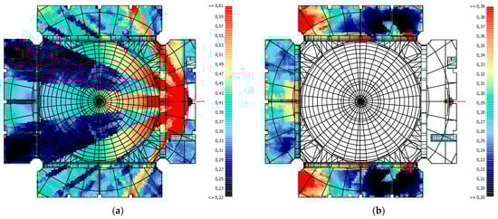 When the LF80 parameter, one of the parameters related to sound energy, is analysed for the sermon activity, the general average of the masjid is approximately 0.32. This value is below the lower limit of 0.35 for speech. While the values obtained in MF are close to the masjid average, the highest values were obtained in BMR and UMR, respectively. The values obtained in UML are approximately 0.35, which is the lower limit of the reference value. The lowest values were obtained in BMB, UMB and BML, respectively, and they were below the reference value. The overall average of the masjid also decreased, with low values in these regions (Figure 22a). The majority of the reflections at BMB and UMB are either near-overhead reflections from the dome or delayed reflections from the side walls with long reflection paths. Consequently, the lowest values were obtained in these regions. In the BML, the majority of the region exhibits low LF80 values due to the fact that the majority of the region does not receive direct sound and instead receives the majority of the reflections from the side walls beneath the minbar and right mahfil. There is a considerable area in front of the mihrab and minbar, where values above the reference value are obtained. In these areas, there are surfaces that can provide reflections to the receivers shortly after the direct sound. Furthermore, when the boundaries of this region are analysed, it is evident that the entire area where the side wall near the sermon pulpit provides reflection, as well as the area where the minbar provides reflection, are of significant interest. The highest LF80 values for the masjid were obtained in front of the mihrab, where the two intersect. When the mahfil floor values are analysed, it becomes apparent that high values are obtained in the front areas, where most of the reflections are lateral, while the reflections received in the rear areas are mostly overhead reflections. Consequently, LF80 values are low (Figure 22b).