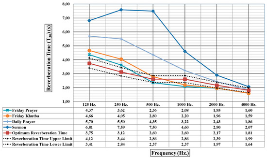The ideal reverberation time for masjids during Friday prayers, Friday khutba, and daily prayer activities remains constant at medium frequencies. However, it is expected to increase by 20% for low frequencies (125 Hz and 250 Hz) and decrease by 20% for high frequencies (2000 Hz and 4000 Hz) [28]. Therefore, assumptions were made in this direction for the optimal reverberation time values for Friday prayer, Friday sermon, and daily prayer activities. For speech activities, a constant reverberation time is expected for all frequencies [28]. In the sermon activity, the values calculated for 500 Hz at all frequencies were accepted as reference values.