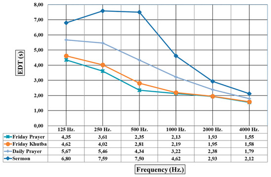 The average values obtained in four different activities for the EDT parameter, which indicates the early part of the energy, demonstrate that EDT values are also high in activities with high T30 values. This is concurrent with the reverberation time. However, since the reference value for the EDT value is in the range of ±10%, the values obtained in each activity are very close to the reverberation times and are generally within the optimum value range (Figure 26).