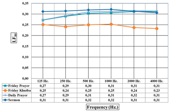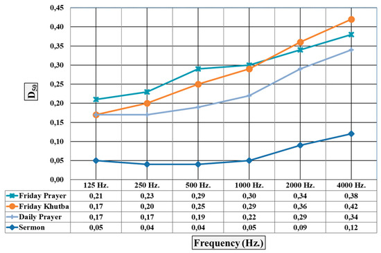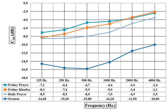 Upon analysis of the results obtained from the simulation of the C50 parameter from the sound energy parameters, it was observed that the lowest value was attained in the Sermon activity with the highest T30 and Ts values. The Friday Prayer and Friday Khutba activities exhibited the highest values, respectively. The Daily Prayer activity exhibited relatively lower values. Values below the reference value of >0 dB were obtained for all activities and all frequencies (Figure 27).