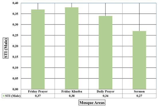 When the STI values, which are another speech intelligibility parameter, are analysed, it is seen that the lowest value is obtained in the Sermon activity and the highest value is obtained in the Friday Khutba activity (Figure 30).