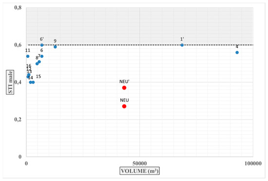STI male values of the mosques in the literature (blues) and the investigated masjid (reds).