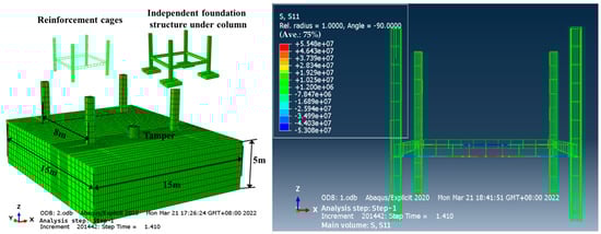 ABAQUS was used to create the computational model of the compactor, the independent foundation structure under the frame columns and the backfill, as shown in Figure 1. The compactor model is cylindrical with a height of 1 m, a diameter of 1 m and a mass of 6.2 t. The dimensions of the backfill model were 15 m and 5 m high, and the soil was divided into upper and lower layers according to the position of the foundation tie beams, with the lower layer being the backfill that had reached the compaction standard and the upper layer being the initially compacted fill. The independent foundation under the frame columns is a reinforced concrete structure, and the specific soil and structural parameters obtained based on field experiments are shown in Table 1. Each component is divided by eight-node hexahedral reduced integral (C3D8R) solid units, and the soil is modelled by the Drucker–Prager elastic–plastic model (the relevant soil parameters are shown in Table 1), with a unit size of 200 mm. The concrete is modelled by a solid unit with a unit size of 300 mm, which contains 219,891 units and 87,657 nodes (obtained through mesh density sensitivity analysis). The rebar model is then modelled using beam cells with a cell size of 100 mm. As determined by the boundary condition sensitivity analysis, displacement constraints were set at the bottom of the bearing and at the soil boundary to ensure stability; at the same time, the connection parts of the columns and tie beams were considered to be fixed, constraining all the degrees of freedom. In order to simulate the change rule of impact load transfer in the soil body, this paper adopts the triangular impact load model [19,20], whose action time is set to 0.1 s. In order to investigate the effects of different tamping energies and backfill thicknesses on the structural forces of free-standing foundations under columns during hydraulic ramming, these two factors are analysed in this study. Three types of tamping energy, 30 KJ, 36 KJ and 42 KJ, were selected according to the most common types of hydraulic tampers, and four different single backfill thicknesses, 0.5 m, 1.0 m, 1.5 m and 2.5 m, were selected.