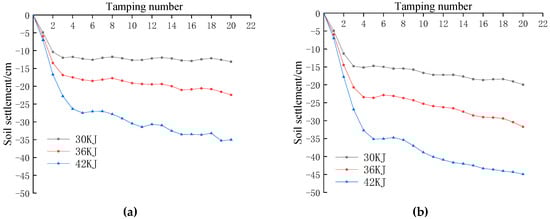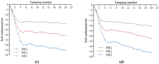 Soil settlement is determined by monitoring and analysing the displacement of the top of the soil in the vertical direction after being subjected to ramming. The settlement is monitored as the vertical displacement of the centre point of the FE grid subjected to the impact load. As shown in Figure 2, the variation curves of the cumulative soil settlement with the number of ramming strokes were obtained according to the numerical calculation results for different ramming energies and backfill thicknesses. From the figure, it can be clearly seen that the cumulative settlement of the soil body under different backfill thicknesses with the increase in the number of ramming shows a basically consistent pattern of change, i.e., the greater the ramming energy, the greater the cumulative settlement of the soil body. And when the number of ramming reaches 3~4 times, the cumulative settlement of the soil body basically tends to stabilise. According to the “Technical Code for Ground Treatment of Buildings (JGJ79-2012)” for a single tamping settlement less than 50 mm stop tamping provisions [21], from this research, it can be concluded that the number of tamping is equal to four can be used as the optimum number of tamping under the three types of tamping energy. The soil settlement of the fourth tamping under different working conditions is shown in Table 2.