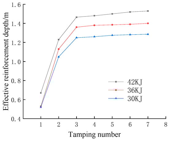 According to previous related studies [22,23], this paper chooses to regard the depth of soil body with vertical displacement less than 0.015 m after a single tamping as the effective reinforcement depth. The variation curve of the effective reinforcement depth with the number of rammings for different ramming energies under 2.5 m backfill thickness was obtained by calculation (using Expression (1)), as shown in Figure 3. It is clear from the graph that the greater the tamping energy, the greater the effective depth of reinforcement. The effective depth of reinforcement increases with the number of ramming strokes; however, the increase gradually decreases. After the third ramming, the effective depth of reinforcement hardly changes at different ramming energies, which is close to the number of ramming strokes at which the cumulative settlement of the soil reaches stabilisation. The effective depth of soil reinforcement for the two working conditions of 1.5 m and 2.5 m backfill thickness was obtained by calculation (using Expression (1)), as shown in Table 2. As can be seen from Table 3, the thicker the backfill in the upper part of the tie beams, the deeper the effective reinforcement depth of the soil body at the same ramming energy, indicating that the lower anchor does have an effect on the effective reinforcement depth, but the effect is relatively small. Therefore, the effective reinforcement depth of the fourth ramming at 2.5 m backfill thickness can be used as a criterion for ramming. At the same time, the reinforcement depth calculated by the modified formula is basically close to the effective reinforcement depth, demonstrating the applicability of the modified Menard formula.
