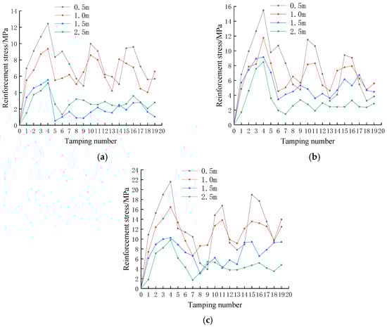 Stress curve of reinforcement under different working conditions: (a) 30 KJ tamping energy; (b) 36 KJ tamping energy; (c) 42 KJ tamping energy.