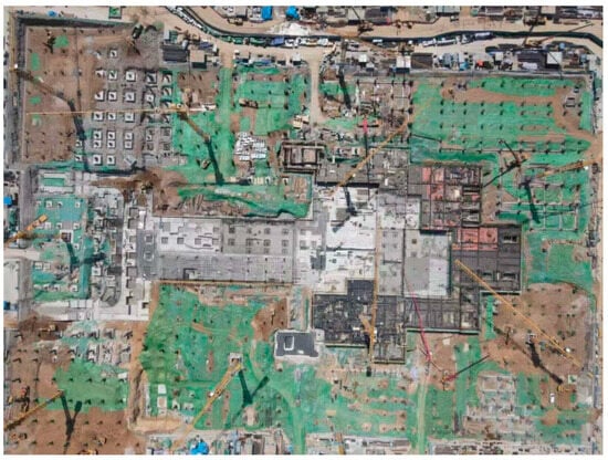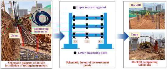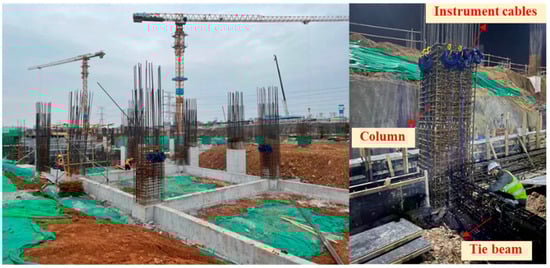 In order to verify the accuracy of numerical calculations and investigate the force of independent foundation under columns in the whole construction process, this paper relies on a foundation project in Jinan to carry out on-site tests. The independent foundation under a frame column design scheme was adopted for this project, and its engineering location is shown in Figure 5. Due to the depth requirements of the foundations, tie beams were installed between the columns to increase the stability of the overall structure. The foundation elevation range is −9~0 m, and a tie beam structure is designed at −6 m, −3 m and 0 m within this range. To ensure the stability and safety of the structure, the atrium and the surrounding area were backfilled with plain fill. In terms of material selection, the columns and tie beams are made of C35 grade concrete structure, and φ25 mm HRB400 type reinforcing bars are used to enhance their load bearing capacity and seismic performance. For the construction of the independent foundation under the frame columns, a layered backfill and layered tamping method was used to ensure that each layer of backfill could be adequately compacted and stabilised. According to the results of numerical calculations, the thickness of the individual fills is controlled within 1.5 m to ensure the uniformity and compactness of the backfill.
