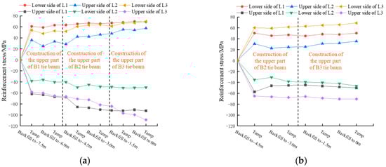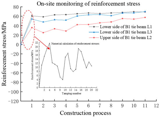 In this study, the reinforcement stresses were analysed for tie beams B1 and B2 as shown in Figure 8. In order to reduce the error, the reinforcement stresses in the upper part of the tie beams after the first filling were set to an initial value of 0, and the reinforcement was specified to be positively compressed. From Figure 8, it can be seen that the upper side of the reinforcement stress at L1 and L3 measuring points is tensile and the lower side of the reinforcement stress is compressive. The stresses in the upper side of the reinforcement at L2 are compressive, and the stresses in the lower side of the reinforcement are tensile, which agrees with the numerical calculations. The tie beam reinforcement stress showed an increasing, fluctuating and smooth trend throughout the construction process, and the value of the reinforcement stress was in the range of −90~30 MPa, reaching 18.5~55.5% of the warning value (given in Table 3). A sudden increase in the reinforcement stress of the tie beam occurs after each ramming. For example, in the case of the B1 beam, the first tamping (1.5 m backfill thickness) showed the largest increase in reinforcement stress with an increment of about 35–60 MPa, reaching 21.6–37.1% of the warning value (given in Table 3). The second tamping (backfill thickness 3.0 m) showed a slight increase in reinforcement stress with an increment of about 2 to 8 MPa, indicating that the tamping of the backfill in the upper part of the B2 beam had an effect on the stresses in the B1 beam. It was analysed that the increase in stress in the B1 beam after the second tamping was not directly caused by the tamping but was related to the resulting synergistic stresses in the B2 beam.