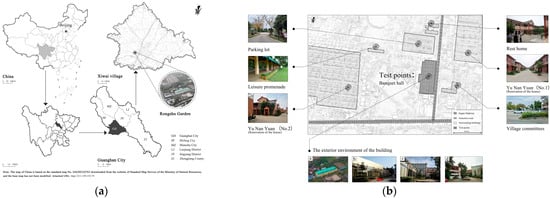 Location map of the banquet hall. (a) The banquet hall is located in the Banyan Tree Garden area of Nanlin Village, Xiwai Township, Guanghan City, Sichuan Province, China []; (b) Schematic diagram of the project’s surrounding functional areas, including parking lots, recreational zones, and residential points.
