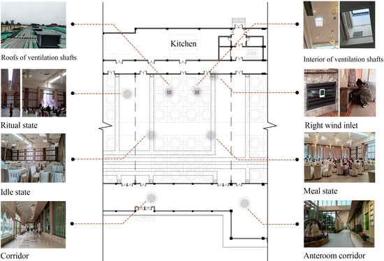 The functional spaces of the building are primarily divided into three main parts: the kitchen service area, the ceremony waiting and rest area, and the banquet units (Figure 2). The banquet units, which are primarily used for dining and wedding ceremonies, form the core functional space of the building. The design accommodates the simultaneous hosting of multiple events, with the capacity to serve over 1000 guests. To address the variability in the number of attendees for different banquets, the design was based on statistical conclusions drawn from over 100 previously hosted events in the park. The approach used was to design the banquet hall units based on “high-frequency attendance (Hall No.1, No.2, and No.3) + flexible space design (Hall No.4)”, resulting in a layout of three high-frequency banquet units (each with a standard capacity of 240 people) joined end-to-end from north to south, along with one medium-frequency banquet unit (with a standard capacity of 360 people). All four banquet units utilize a large-span frame structure with a depth of 24 m. The high-frequency units have a width of 21 m, while the medium-frequency unit has a width of 32 m. Each banquet unit features high single-story vertical spaces, with interior heights gradually increasing from 8.8 m at the sides to 10.7 m at the center. A narrow skylight at the highest central point of each unit allows sunlight to stream in during ceremonies, illuminating the red carpet area and creating a solemn and sacred atmosphere. To accommodate the less frequent demand for super large-scale banquets with over 500 guests, flexible partitions are used between each banquet unit along the north-south axis, allowing the units to be combined as needed. Additionally, to meet the visual requirements of the facade, the need for guest waiting areas before banquets, and the service requirements for large-scale banquet catering, the east and west sides of the banquet units are designed as kitchen service corridors and waiting spaces. This arrangement of multi-hall connections along the north-south axis and functional zones along the east-west axis constitutes the banquet units (Figure 3).To enhance indoor-outdoor air exchange and ventilation, and to address the conflict between thermal comfort demands and ventilation energy consumption, the banquet hall employs a ventilation system where air enters from the northern end of the building and is distributed through a ground-level tunnel system, with exhaust vents located at the top of each hall. A subterranean ventilation system is installed at specific locations on the lower basement level to serve the banquet halls. This system includes four ducts of varying lengths that connect to the interior of the banquet hall, with each of the first three units having four ground-level air inlets, while the fourth unit has six. Each unit also features eight exhaust vents integrated with lighting at the top, making a total of 32 exhaust vents across all four units. This experiment aims to determine, through empirical data and calculations, whether this natural ventilation system of “ground-level tunnel air supply and top-level exhaust” can meet the daily ventilation requirements of a large, windowless public building with high occupancy.