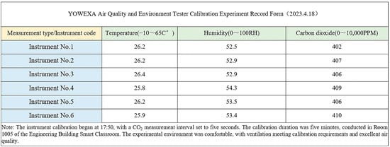 To ensure instrument precision and test result reliability, a thorough calibration process was conducted before starting the official experiments. The procedure involved several key steps (Figure 4): First, we checked the battery levels and basic functions of all YOWEXA air quality and environmental testers to ensure they were in good working condition. Then, the six experimental devices were set with standard temperature, humidity, and other relevant parameters. They were placed in a temperature and humidity-controlled empty classroom. The readings displayed by the instruments were recorded and compared with the standard values. If discrepancies were found between the readings and the standard values, the instrument settings were adjusted until the displayed values matched the actual parameters of the standard environment. Once the instrument data matched the actual parameters, the six devices were relocated to different positions within the temperature and humidity-controlled classroom, and their readings were recorded again. Finally, the results of each calibration were documented and saved as part of the subsequent analysis, ensuring that the instruments could maintain optimal working conditions throughout the entire experiment. The following are the specific calibration steps and results: