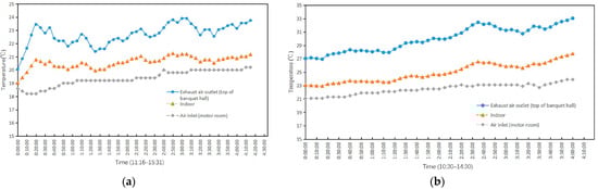 Temperature data statistics at various points in the banquet hall utilizing the “bottom underground ventilation + top exhaust” natural ventilation system: (a) Measured temperature variation data at each point on 22 April with 100 participants; (b) Measured temperature variation data at each point on 2 May with 200 participants.