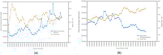 Residual heat and residual heat removal efficiency in Banquet Hall No.2: (a) Residual heat and heat removal efficiency in the indoor space during the test on 22 April with 100 participants; (b) Residual heat and heat removal efficiency in the indoor space during the test on 2 May with 200 participants.