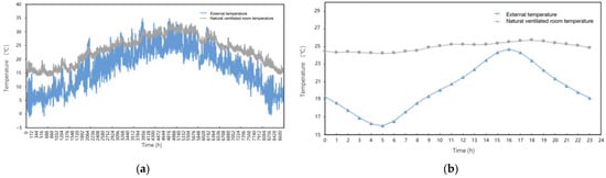 Schematic diagram of test data for Banquet Hall No.2 based on real environmental conditions: (a) Comparison of outdoor and indoor temperatures throughout the year in the simulation experiment; (b) Comparison of outdoor and indoor temperatures throughout the day.