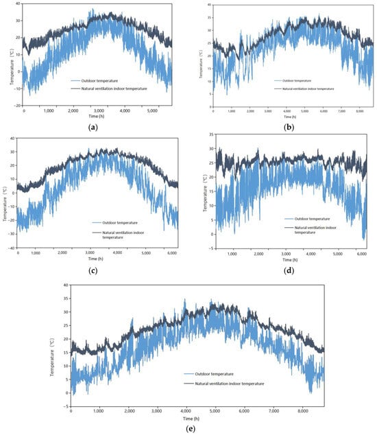 Before conducting simulation experiments for different representative cities, this study first performed a simulation experiment on the indoor temperature variations of Banquet Hall No.2 under natural ventilation conditions, based on the existing site conditions of the banquet hall. The experimental results, as shown in Figure 11, indicate that the lowest indoor temperature throughout the year is 15 °C, while the highest is 33 °C. The annual temperature trend shows an initial rise followed by a decline, closely mirroring the fluctuations in outdoor temperature. This indicates that the thermal insulation performance of the building envelope in the model plays a crucial role in maintaining indoor temperature stability, thus avoiding potential errors in the simulation process.