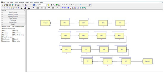 According to the actual investigation of the ordinary precast beam yard of a highway 2 standard 3, in the production process of the beam yard, the working time of workers is generally 8 h; under normal circumstances, it is 8:00–12:00 in the morning and 3:00–7:00 in the afternoon. However, if special circumstances need to rush the construction period, the working hours will be appropriately extended according to the actual situation. Therefore, in the process of modeling with Arena 14.0 software, this paper made the following assumptions about the model: