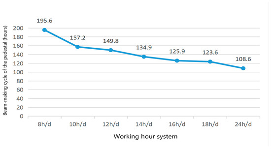 In this paper, the influence of different working time systems on the beam-making efficiency of a single pedestal was studied. The above experiments were carried out on the seven working time systems of 8, 10, 12, 14, 16, 18, and 24 h/d, and the simulation results shown in Table 2 were obtained.