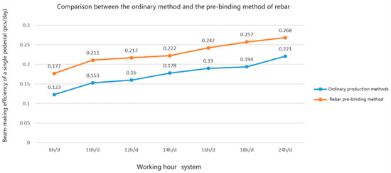 As can be seen in Figure 9, when using the pre-binding method of steel bars or the ordinary production method, the beam-making efficiency is improved with the extension of man-hours, which is consistent with traditional cognition. Under the normal condition of working for 8 h a day, the beam-making efficiency of the two methods is 0.123 and 0.177 per day, respectively. The beam-making efficiency of the beam field is increased by 43.9% by the steel bar pre-binding method, and the beam-making efficiency is improved very obviously. However, in the ultimate state, the beam-making efficiency of the two methods is 0.221 per day and 0.268 per day, respectively. The beam-making efficiency is increased by 21.3%, and it is found that with the extension of the working time system, the advantages of the steel bar pre-binding method gradually decrease. This shows that the method does improve the beam-making efficiency to a certain extent, but this is realized by separating the reinforcement binding process. In addition, the reinforcement pre-binding method does not fundamentally change the operation time of the beam-making process, so it results in a very limited improvement in the beam-making efficiency.