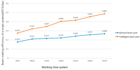 We compared the production efficiency of the traditional beam yard with the production efficiency of the intelligent beam yard. The comparison diagram of the production efficiency of the pedestal beam-making is shown in Figure 11.