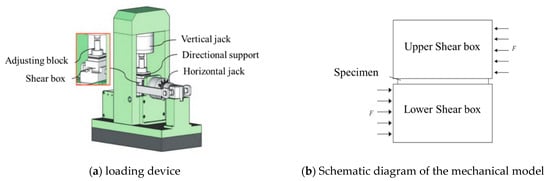 The displacement-controlled loading pattern was adopted in the loading process. After the specimen was installed, the axial and horizontal preloading were applied to eliminate the gap between the specimen and the apparatus. Moreover, the axial compression was maintained during the loading process, though it remained negligible compared to the horizontal shear, with a value below 1 kN. The load was applied monotonically at a constant rate of 0.002 mm/s until the specimen was ultimately damaged. All the test methods were conducted in accordance with the Chinese standard JGJ 1-2014, with modifications based on previous studies [,,]. The data of displacement and load during the loading process were recorded through the acquisition system and the load transducer. The direct shear loading diagrams are shown in Figure 2b.